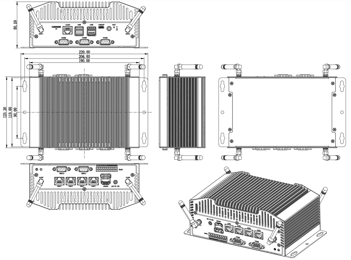 2*DB9 COM; 8 Bit GPIO; 2*ANT