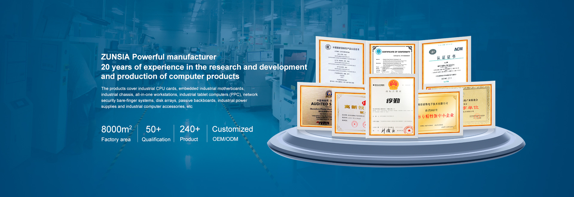 Shenzhen ZunSia Intelligent Technology Co., Ltd. is an enterprise focusing on industrial computer / Internet of Things and other related products development, production and customization sales. Since its inception, the main products include various industrial control computers, OPS computers, industrial CPU cards, embedded industrial motherboards, industrial chassis, integrated workstations, industrial tablet computers (PPC), network security standards, disk arrays, passive boards, industrial power supplies and industrial computer accessories.
