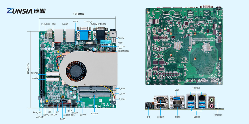 存储方面有1个mSATA和1个SATA3.0接口,显示方面有1个HDMI、1个VGA和1个LVDS/eDP(2选1)接口;丰富的工业接口,有PCIe X16、MiniPCIe、LAN、COM、GPIO、CAN等。可以连接各种电力设备,如传感器、控制器、数据采集设备等,实现对电力设备的监测与控制、存储采集到的电力数据,以便后续分析和处理。